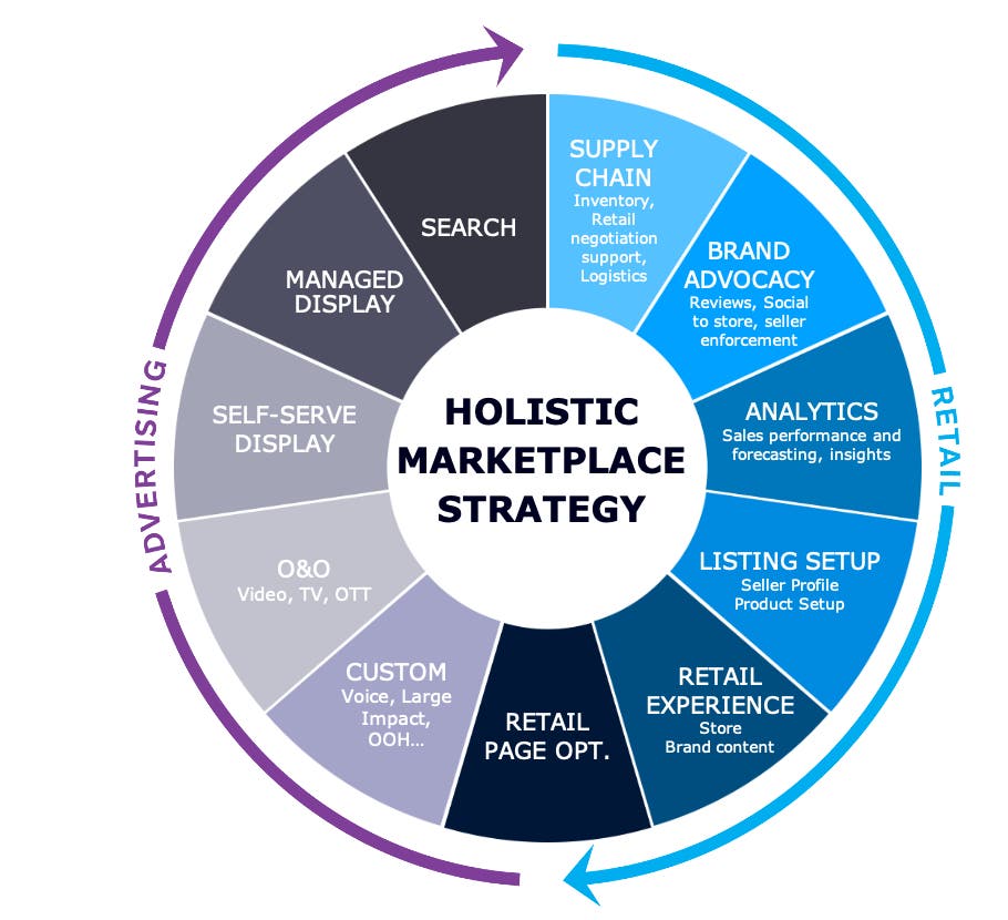 End-to-end solutions spanning retail consulting, merchandising, storefront & content building, eCommerce media buying and closed-loop measurement across the largest and fastest-growing marketplaces, such as Amazon, Walmart, Loblaw, and Google Shopping. We help our clients build their Marketplace presence, grow their existing practice, or transform their approach and relationship with the largest players in the market.