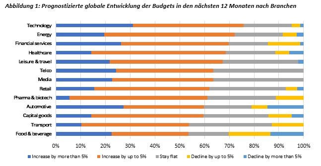 Aus dem CMO Survey 2018 des Dentsu Aegis Network geht hervor, dass sechs von zehn Marketingverantwortlichen in den nächsten zwölf Monaten mit einem steigenden Werbebudget rechnen. 41% der Befragten planen Erhöhungen von bis zu 5%, mehr als jeder fünfte Befragte (21%) geht sogar von einem noch höheren Anstieg aus. Am zuversichtlichsten sind die CMOs aus der Technologie-, Automobil- und Finanzbranche.