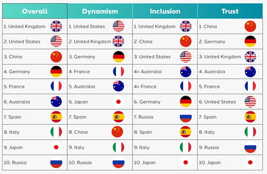 Beim Übergang hin zu einer digitalen Gesellschaft belegt Deutschland im internationalen Vergleich den vierten Platz hinter den USA, UK und China. Hinsichtlich der einzelnen untersuchten Bereiche zeigen sich erhebliche Unterschiede. So schneidet Deutschland zwar bei Vertrauen und Dynamik sehr gut ab (Platz 2 bzw. 3), landet bei der Inklusion digitaler Technologien aber nur im hinteren Mittelfeld (Platz 6) der teilnehmenden Länder.