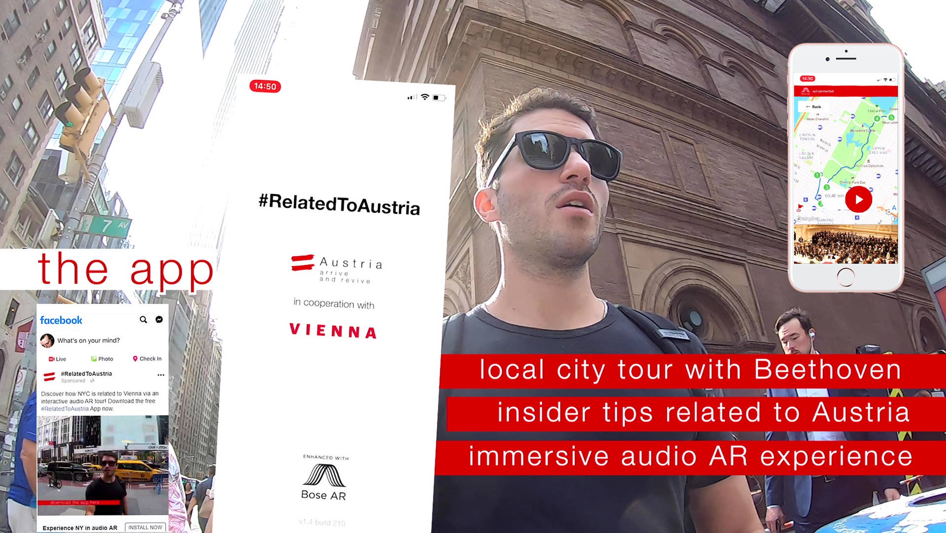 Mittels der speziell entwickelten App #RelatedToAustria, wurden New Yorker und Touristen der Stadt via GPS zu fünf Orten, die einen Bezug zu Österreich aufwiesen, geführt. An jedem dieser Orte erwartete die Menschen ein perfekt auf den Ort abgestimmtes Augmented-Reality-Audioerlebnis - zum Leben erweckt durch die Stimme Beethovens und spezielle AR-Audioeffekte. Das Medium: ein fortgeschrittener Audio-Guide, der - gekoppelt an die neue #RelatedToAustria-App am Smartphone – über Lautsprecher an den Bügeln einer stylischen Sonnenbrille den Städtetrip zum interaktiven Erlebnis macht.