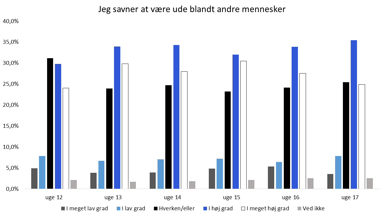 Blandt 1000 respondenter er der i gennemsnittet 60,8%, som i høj grad og meget høj grad savner at være ude blandt andre under corona-nedlukningen. Et savn, der er steget i løbet af corona-perioden.