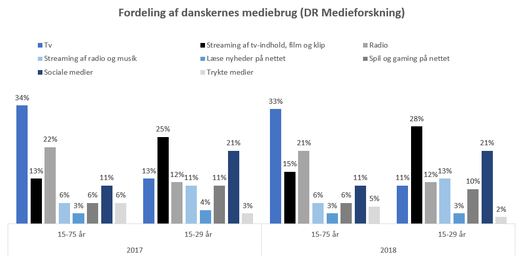 Den samme tendens gør sig gældende, hvis man kaster et blik på den nyeste medieforskningsrapport fra DR. Her er forbruget dog ikke gjort op i minutter per dag, men viser i stedet en fordeling af danskernes totale medieforbrug. Her ses det, at den gennemsnitlige dansker mellem 15-75 år bruger 33% af deres samlede medieforbrug på flow tv, mens tallet for samme medie kun er 11%, hvis man isolerer de 15-29-årige.