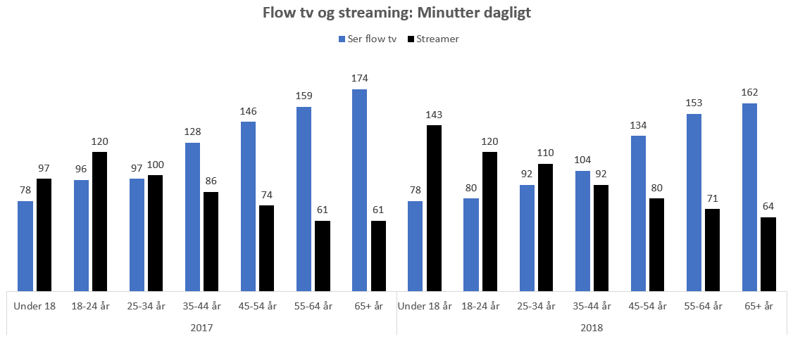 Den pointe ses også tydeligt, hvis vi ser på data fra vores egen forbrugerdatabase, M1 Panel. Her fremgår det, at de ældste forbrugere ser dobbelt så meget flow tv som de yngste forbrugere opgjort i minutter per dag. Ser vi derimod på streaming er billedet omvendt: Her ser de yngste forbrugere godt og vel dobbelt så meget streaming som de ældre forbrugere opgjort i minutter per dag.