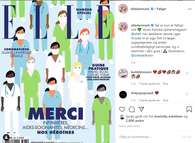 Et eksempel på et brand, som med respekt taler ind i den nuværende situation og appellerer til forbrugerne, er magasinet Elle, der i Frankrig har dedikeret en hel forside til sundhedspersonalet.