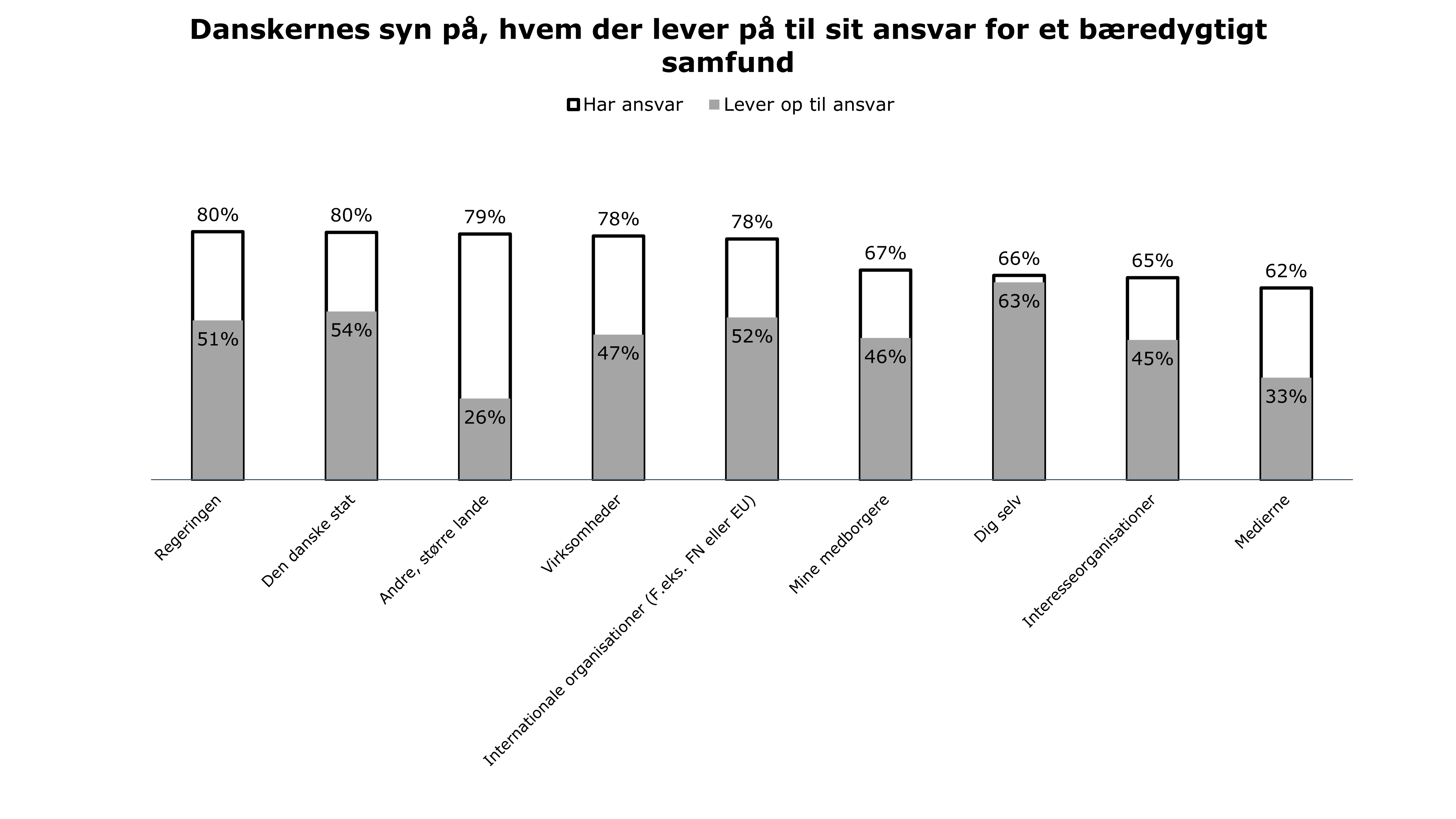 Spørgsmål: I hvilken grad har følgende personer eller organisationer ansvar for, at vi har et bæredygtigt samfund? (meget stort ansvar + stort ansvar).