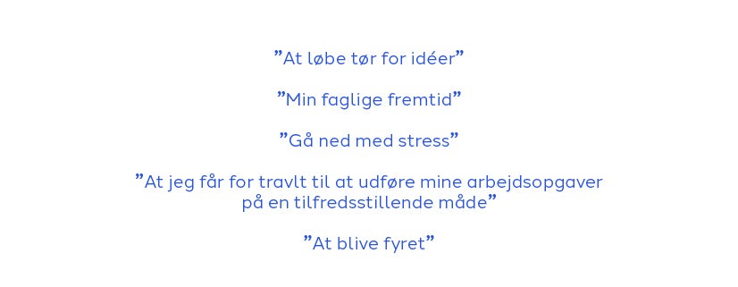 Besvarelserne peger altså på, at deltagerne er glade for deres arbejde, men samtidig bekymrede for, om de mon får lov at beholde det arbejde, som motiverer dem og gør dem glade. Generelt handler marketingfolks arbejdsrelaterede bekymringer om det nære: Hvad står jeg i fremtiden? Kan jeg fortsat gøre de ting, der motiverer mig? Får jeg stress?