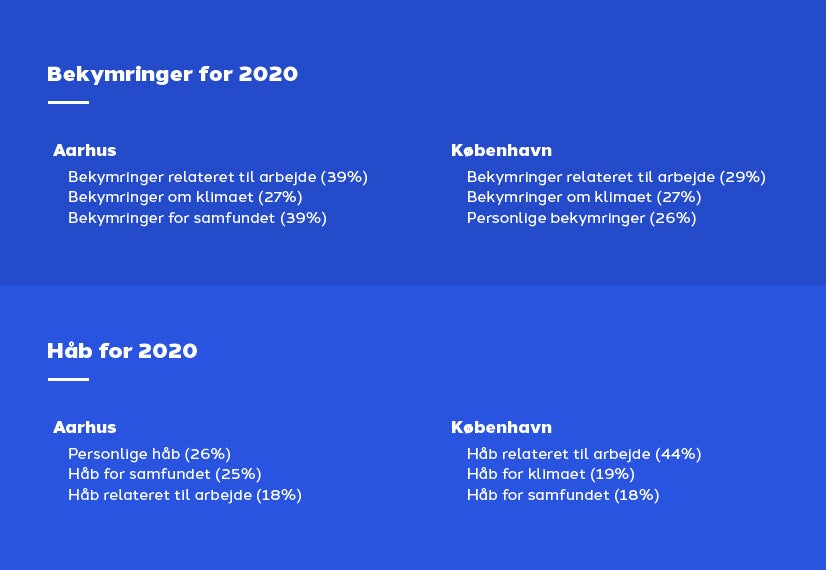 Calm their anxiety. Sådan lød det fra scenen, da vi i slutningen af november præsenterede vores trendstudie PULSE20. Pointen i tendensen er, at forbrugerne bekymrer sig som aldrig før, og at brands skal formå at omfavne og afhjælpe de mange bekymringer. Med udgangspunkt i den spirende bekymringstendens, som vi ser hos forbrugerne, benyttede vi lejligheden til at spørge de 700 deltagende marketingpersoner, om de også ville dele deres håb og bekymringer for det nye år.