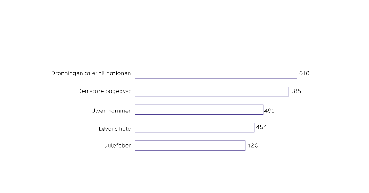 Herhjemme er DR den primære ikke-kommercielle, danske udbyder. I 2020 så top 5 for flest streams således ud: