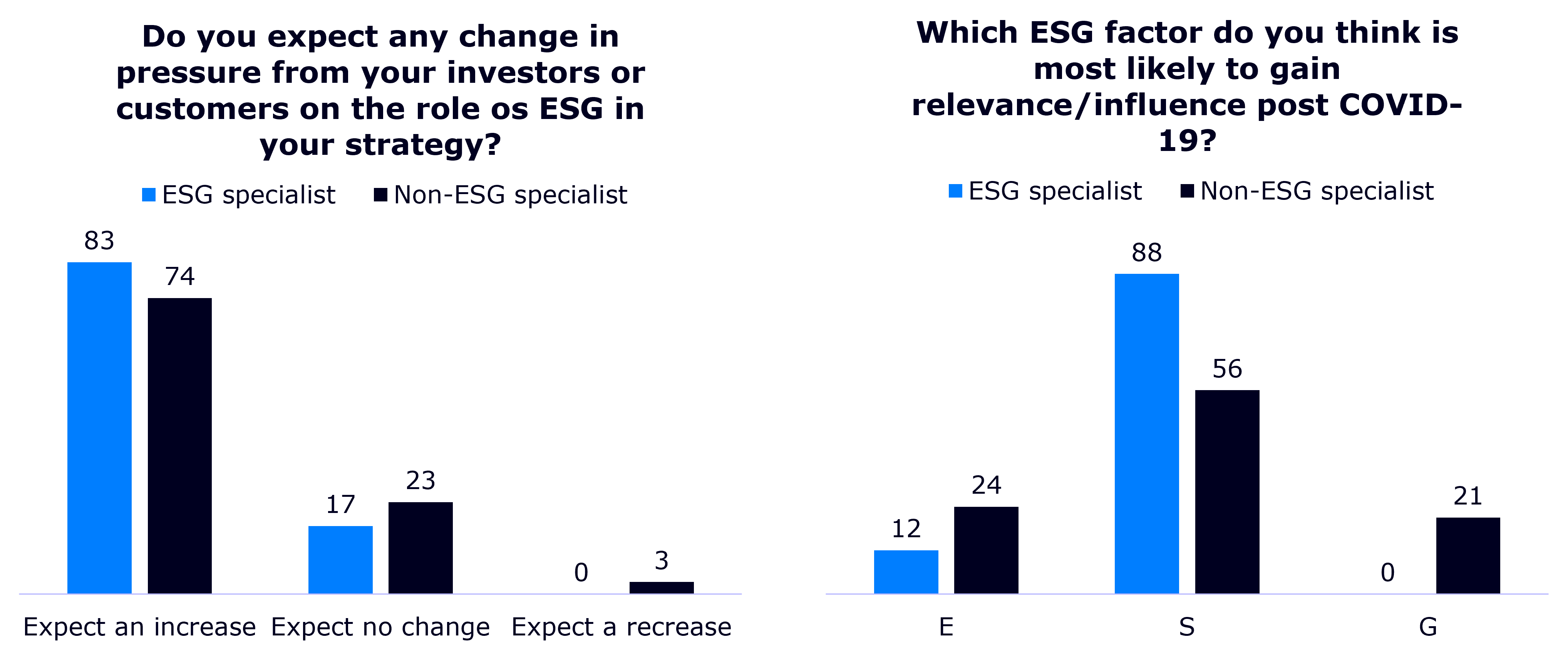Eksempelvis peger en undersøgelse på, at en ny retning ville vinde indpas efter corona-krisen, og i en anden spørgerunde svarer 88% af de adspurgte ESG-specialister, at de forventer, at social-delen vil påvirke tiden efter corona.