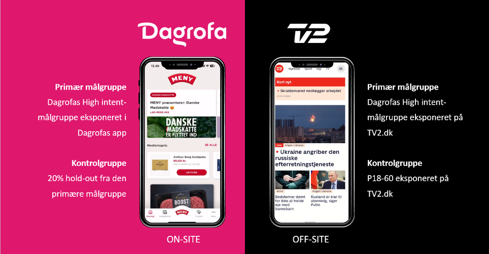 Retail media testen har kørt 4 uger både med displaybannere i Dagrofas app (onsite) og med diplaybannere og video på TV2.dk (off site)