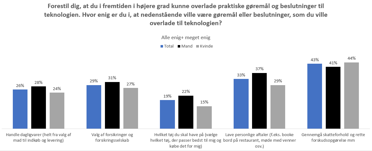 Ser vi på de danske forbrugeres holdning til outsourcing, er vi især villige til at outsource ting som gennemgang af skatteforhold og booking af personlige aftaler som eksempelvis bordbestilling eller aftale med vennerne. Vi er derimod mest skeptiske over for at lade teknologien stå for hvilket tøj, vi skal have på. Det mener vi trods alt, at vi selv er bedst til.