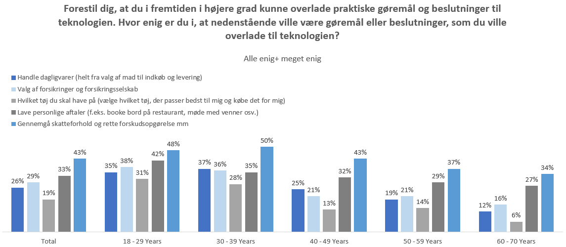 Ser man på forbrugernes alder, tegner der sig et billede af, at det især er blandt de yngre befolkningsgrupper, at outsourcingsbegejstringen er størst. Særligt danskere mellem 18 og 39 år er villige til at outsource hverdagens gøremål. Billedet går igen, ligegyldigt om det handler om forsikringsvalg, tøjvalg, personlige aftaler, gennemgang af skatteforhold eller dagligvareindkøb. Særligt tillidsfulde er de overfor gennemgangen af skatteforløb og personlige aftaler.