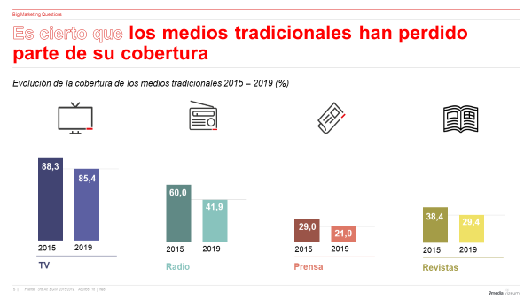 Un realidad conocida es que los medios tradicionales han perdido parte de su cobertura. Así pues, la TV ha pasado de un 88,3% en 2015 a un 85,4% en 2019, la radio de un 60% a un 41,9% o la prensa de un 29% a un 21%.