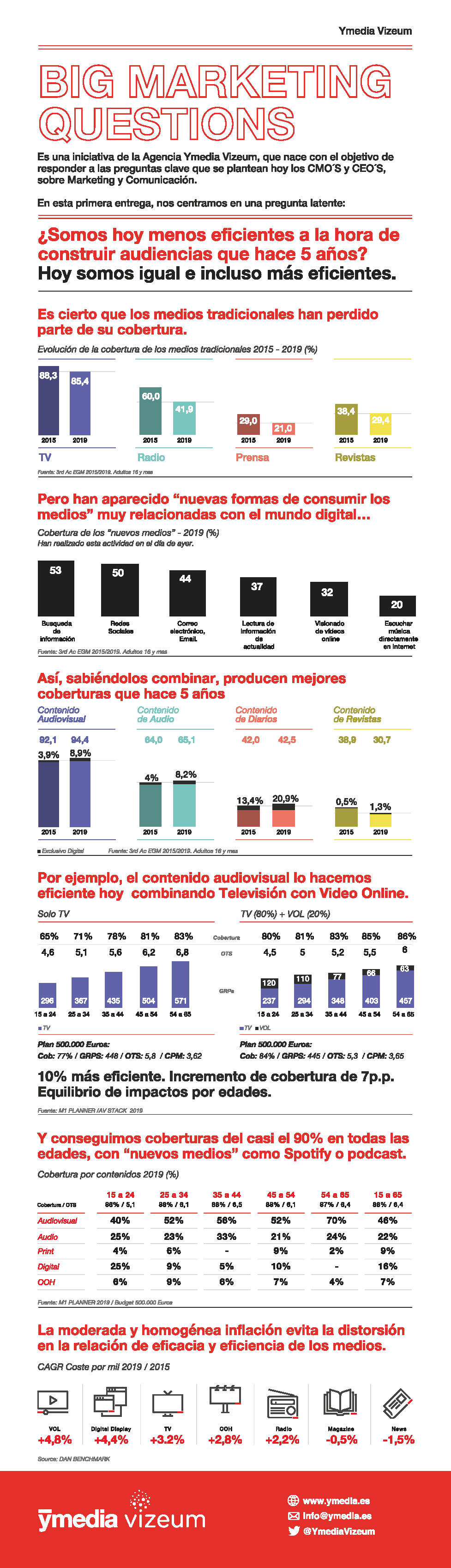 ¿Somos hoy menos eficientes a la hora de construir audiencias que hace cinco años? Esta es la pregunta a la que Ymedia Vizeum da respuesta en esta primera entrega de su Big Marketing Questions. Pese a que los medios tradicionales han perdido parte de su cobertura, la combinación con los nuevos medios digitales permite conseguir mejores coberturas. En este nuevo entorno, la planificación es más compleja y es más necesario que nunca contar con herramientas sofisticadas para optimizarla.