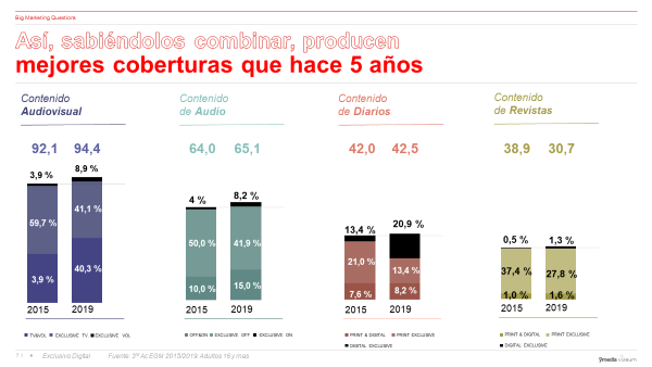 Combinando los medios tradicionales con estas nuevas formas de consumo digital, es posible obtener coberturas superiores a las de hace cinco años. Por ejemplo, en contenido audiovisual pasamos de un 92,1% en 2015 a 94,4% en 2019, de un 64,0% a un 65,1% en audio o de un 42,0% a un 42,5% en prensa. Combinando medios convencionales con nuevos medios como Spotify o podcast, conseguimos coberturas de casi el 90% en todas las edades. Además, la moderada y relativamente homogénea inflación en los últimos años ha llevado a que no se distorsionen las relaciones de eficacia y eficiencia de los medios en el desarrollo de la comunicación de las marcas.