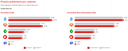 Dentro también del terreno publicitario, pero en la lectura por cadenas, Telecinco sigue liderando el ranking de presión publicitaria, seguida de lejos por Antena 3. Ambas experimentan fuertes incrementos respecto a noviembre de 2019, con subidas que alcanzan el 14% en el caso de Telecinco y del 17% en la principal cadena de Atresmedia.