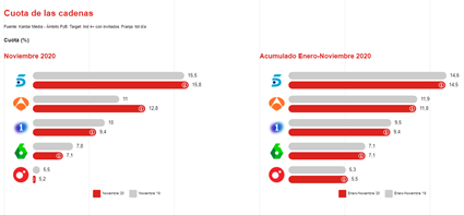 Pasando ahora al terreno de audiencias, Telecinco repite un mes más como la cadena líder, con una cuota media del 15,8%, seguida de lejos por Antena 3 con un 12,8%. Ambas mejoran resultados respecto al mismo mes de 2019, especialmente Antena 3 que estuvo cerca de ganar dos puntos porcentuales en comparación con noviembre del año pasado.