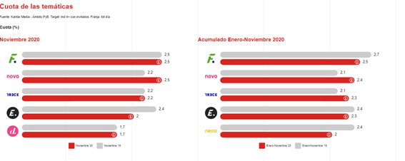 Las cadenas FDF y Nova comparten liderazgo entre las temáticas en abierto el pasado mes de noviembre.
