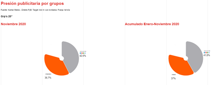 En lo que respecta a la presión publicitaria, el aumento del consumo televisivo viene acompañado de un incremento significativo de la actividad publicitaria en el medio respecto al mismo mes del año anterior. Sin duda, la alta ocupación alcanzada en la semana del Black Friday y el adelanto de muchas de las campañas navideñas han propiciado unos incrementos en el volumen de Grp’s a 20’’ del 9%, en el caso de las RCH, y del 8% en el caso de los Adultos. Este crecimiento del mes de noviembre suaviza el descenso experimentado en el acumulado anual, que registra una bajada del 7%.