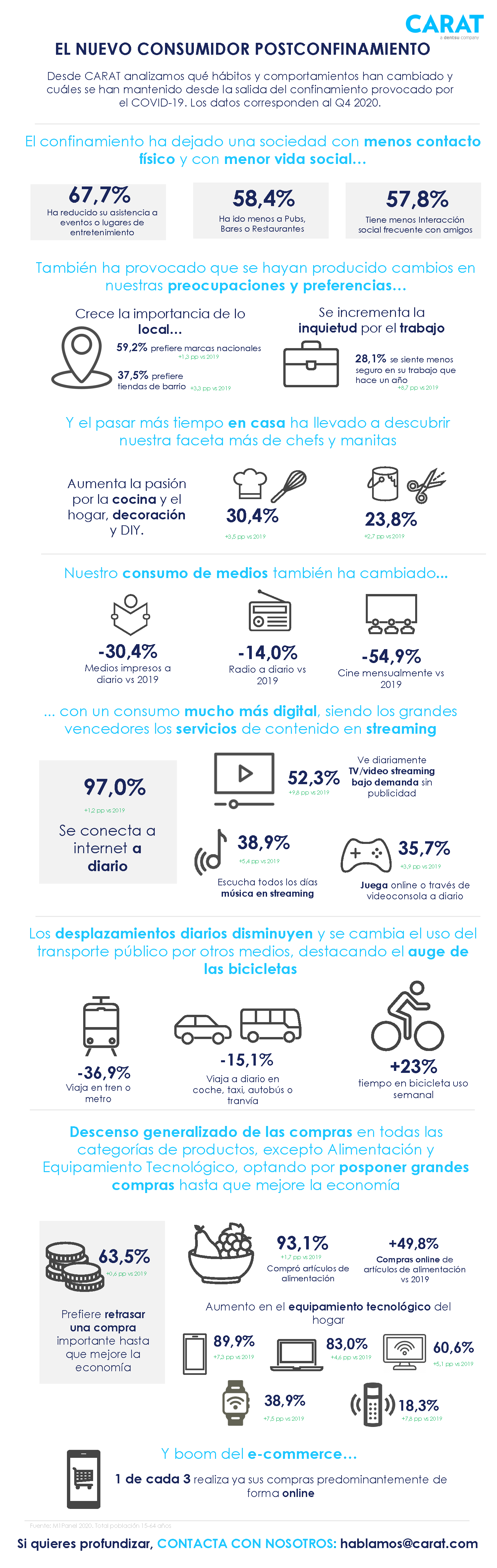 CARAT ha analizado, desde el comienzo de la pandemia, cómo han evolucionado los hábitos y comportamientos de los consumidores. Los últimos datos, correspondientes el cuarto trimestre de 2020, obtenidos a partir de M1Panel (antiguo CCS), cuantifican la reducción del contacto físico y la vida social, señalan los cambios en nuestras preferencias y preocupaciones y confirman el gran impulso de la digitalización.
