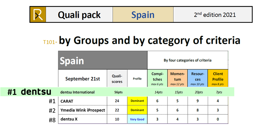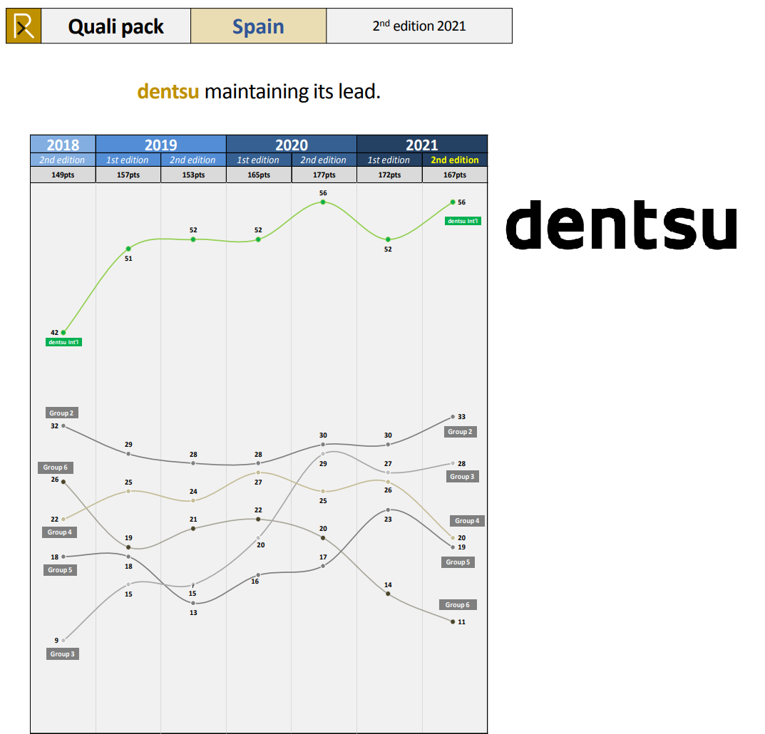 Dentsu España forma parte de dentsu internacional y es el grupo líder la industria de comunicación en España tanto a nivel cualitativo como cuantitativo. Por 4º año consecutivo encabeza la primera posición del informe anual RECMA 2020 (overall Activity volume 2020), con una ocupación del 29.8% de cuota de mercado. Este porcentaje casi dobla al obtenido por el resto de los grupos, la mayor ventaja registrada en los últimos años.