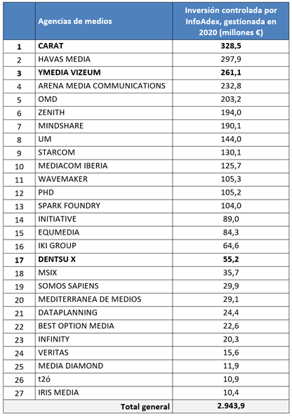 Otra clasificación destacable del grupo dentsu es la de dentsu X, que con tan solo tres años de existencia ya logró en 2019 situarse entre las 20 primeras agencias del mercado español y en este informe se coloca en el puesto 17, con una inversión gestionada de 55,2 millones de euros.