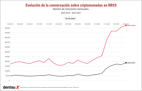 Del mismo modo, el volumen de la conversación en redes sociales en torno a las divisas digitales se ha multiplicado por tres en el último mes, si se comparan respecto al mismo periodo del año pasado. Así, mientras que en abril de 2020 las menciones mensuales apenas superaban los 160.000 comentarios, en abril de 2021, este indicador casi alcanzó los 580.000. En el mismo periodo, la media de autores únicos asciende desde los 44.400 hasta sobrepasar los 185.000. (ver gráfico 4)