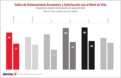 Según estos datos, la sensación de estancamiento económico ha aumentado un 10% y afecta a casi todos los tramos de edad, pero especialmente a las personas de entre 35 y 55 años, en las que asciende hasta el 15%. Sin embargo, este último segmento mantiene el mismo grado de satisfacción ante su nivel de vida respecto al año pasado. (ver gráfico 1)