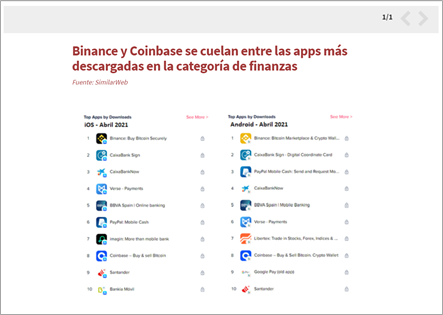El crecimiento de formas alternativas de inversión ocupa también el interés de los consumidores españoles. Según Statista, el 9% de la población española tiene o usa criptomonedas, pero este número no hace más que crecer y así lo demuestran los reportes de tráfico de SimilarWeb. En los últimos meses Binance, exchange de criptomonedas, ha sido la app más descargada en la categoría de finanzas en España, tanto en Android como en iOS, por encima de las apps de los principales bancos. Coinbase, otra app de intercambio de criptomonedas, también se cuela en el top 10 de este ranking. (ver gráfico 3)