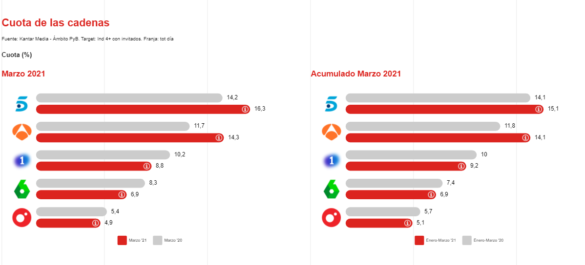 Dando un salto hasta el ranking de cuota de pantalla, Telecinco también obtiene las mejores cifras, con un 16,3% del total, lo que supone alrededor de 2 puntos porcentuales más que el año anterior, aunque Antena 3 gana fuerza aumentando en 2,6 puntos porcentuales su cifra del 2020, situándose en un 14,3%.