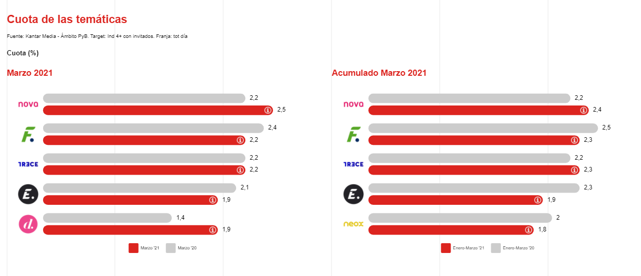 Entre las temáticas, Nova lidera el podio con un 2,5% de share, desbancando así a FDF.