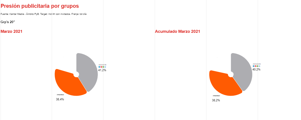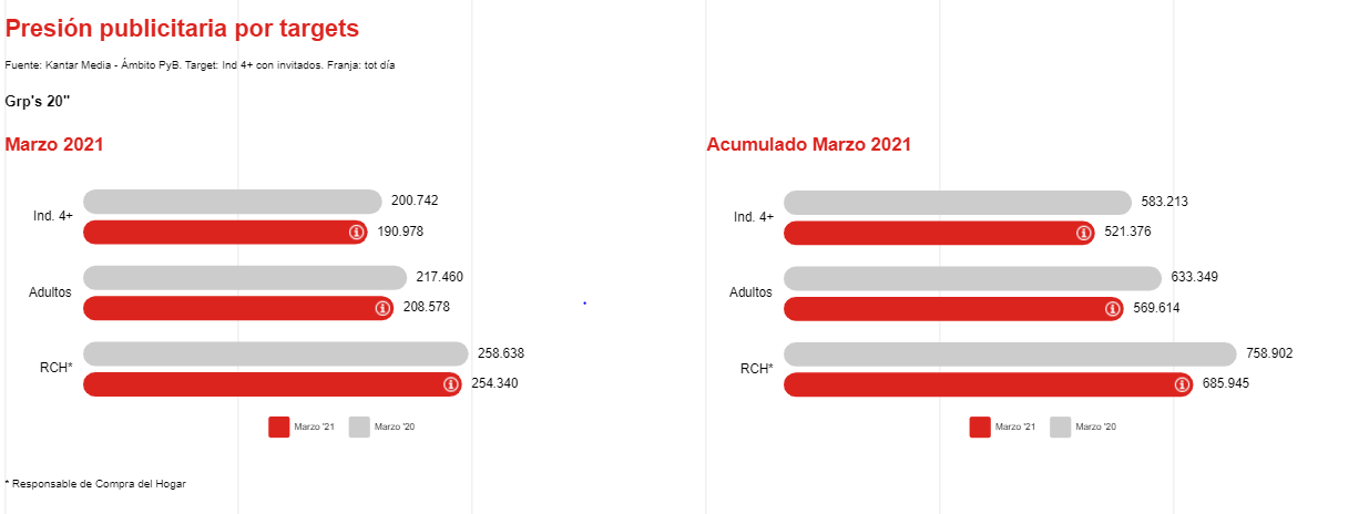 En el terreno publicitario, la presión publicitaria fue inferior a la anotada durante el mes de marzo del año pasado, con alrededor de un 2% de GRP’s a 20” menos para el target RCH y un 5% menos para los individuos de 4 y más años.