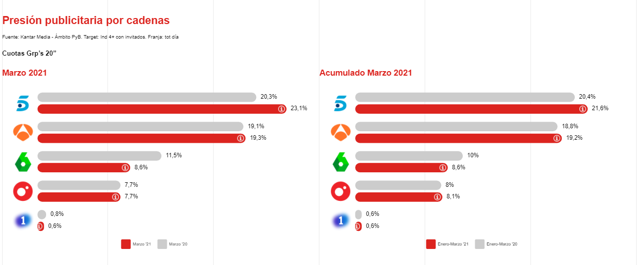 Si nos centramos en la presión publicitaria por cadenas, Telecinco afianza la primera posición en lo que a cuota se refiere, anotando durante el mes pasado un 23,1%, lo que supone casi 3 puntos porcentuales más que los que obtuvo en marzo del pasado año.