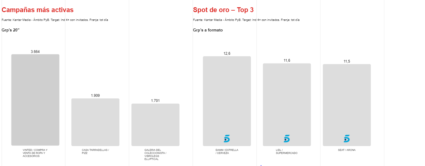 Vinted, con 3.664 GRP’s a 20” se cuelga el oro como la campaña más activa del mes, seguida de lejos por Casa Tarradellas y Galería del Coleccionista. El título del Spot de Oro va a parar a manos de Estrella Damm, con 12,6 GRP’s a formato, durante la prórroga del partido de vuelta de las semifinales de la Copa del Rey disputado entre el Barcelona y el Sevilla el pasado 3 de marzo.