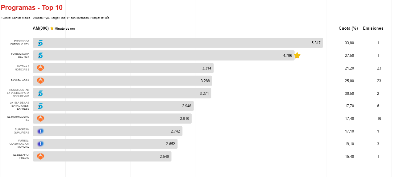 Entre los programas más vistos del mes, el partido entre el Barcelona y el Sevilla en la noche del miércoles 3 de marzo fue la emisión que mejores cifras de audiencia obtuvo, con una media de 4.796.000 espectadores.