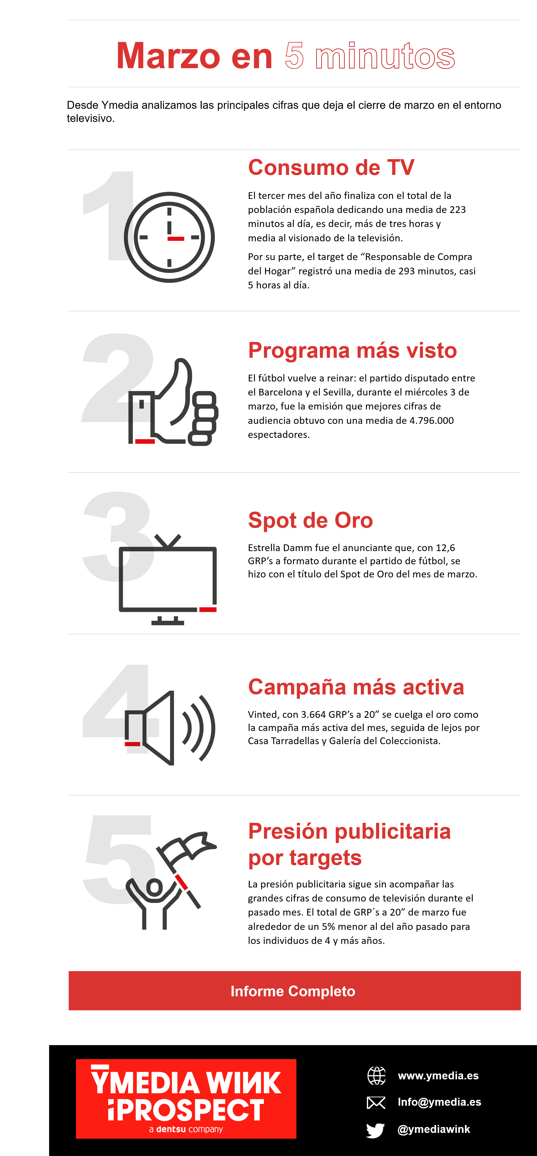 Ymedia Wink ha publicado su informe mensual de publicidad y audiencias en TV, con todos los datos de presión publicitaria, campañas y anunciantes más activos, anuncios más vistos, consumo de TV y cuota publicitaria de las cadenas, “Marzo en 5 minutos”.