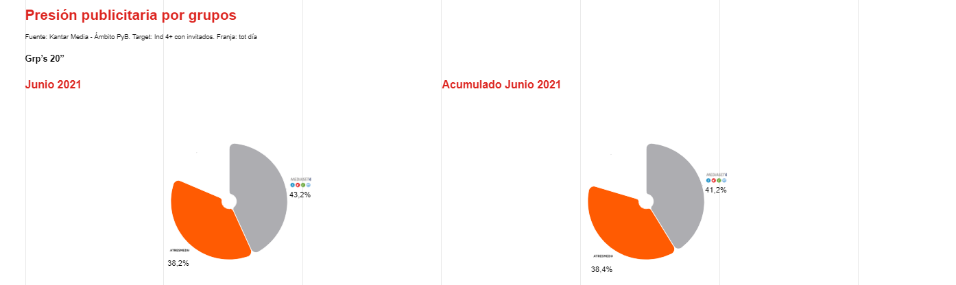 Al analizar la la presión publicitaria por grupos, Atresmedia es el que en la comparativa vs junio 2020 sale mejor parado, con una mejora de cuota sobre el total de Grp’s a 20” de casi un 10%.