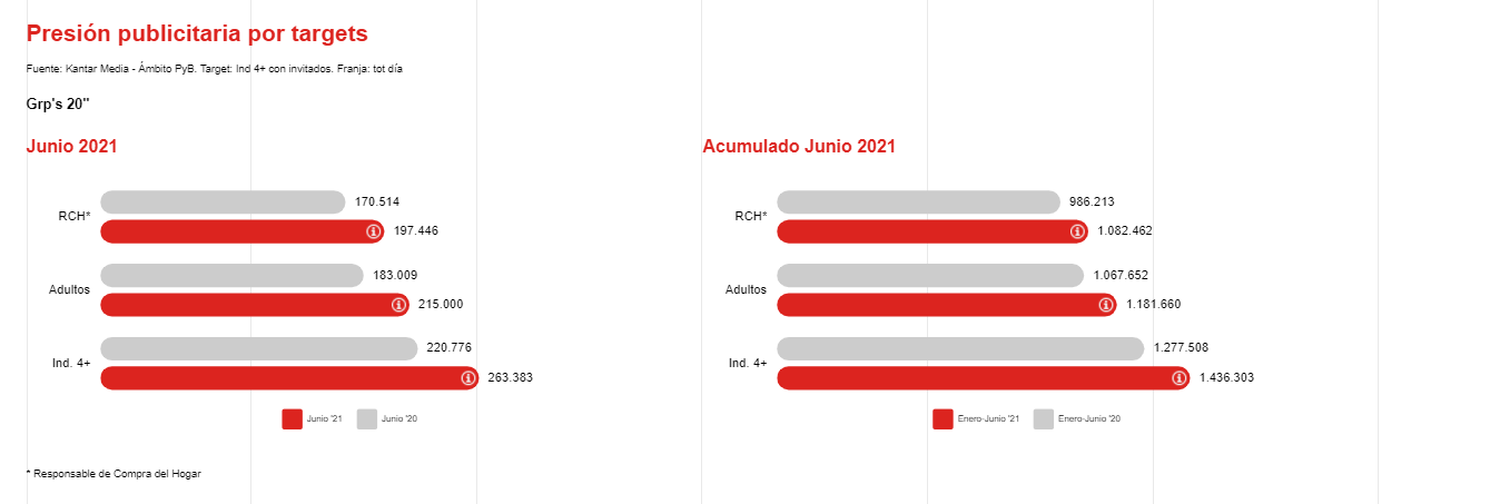 En cuanto a la presión publicitaria por targets, se aprecia una mejora importante en las cifras de Grp’s a 20” de todos ellos, siendo mayor el crecimiento para los individuos de 4 y más años, con un aumento de un 12% del total frente al acumulado de enero-junio del 2020.