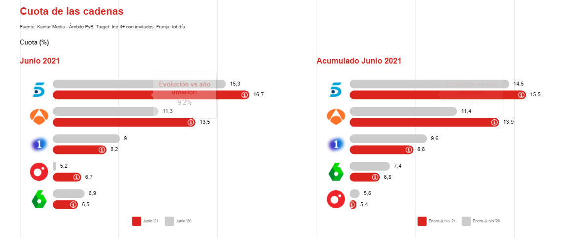 En la lectura de cuota por cadenas, Telecinco refuerza su liderazgo tanto en el acumulado anual como durante el mes de junio, aunque Antena 3 experimenta crecimientos superiores a los de la grande de Mediaset para ambos periodos.