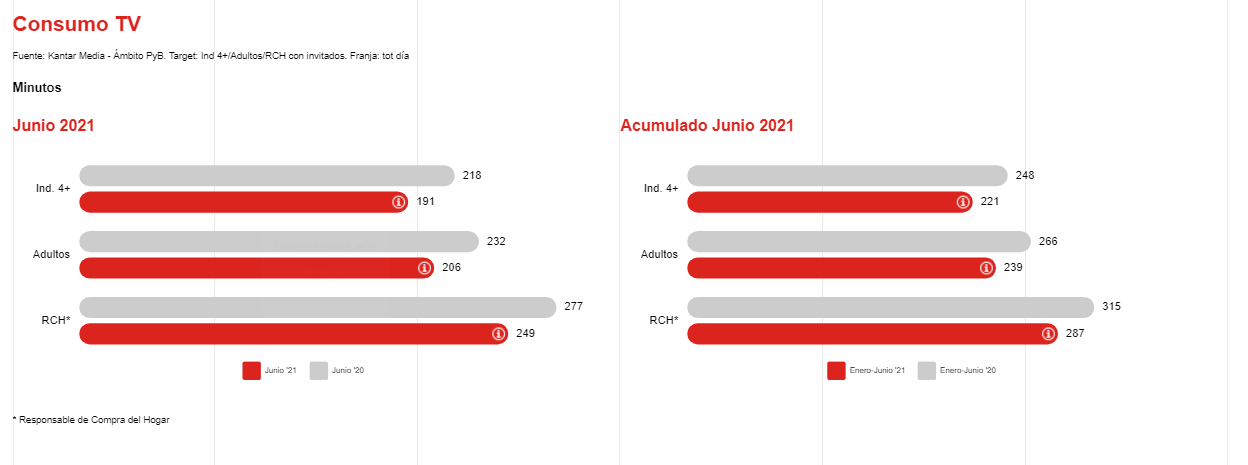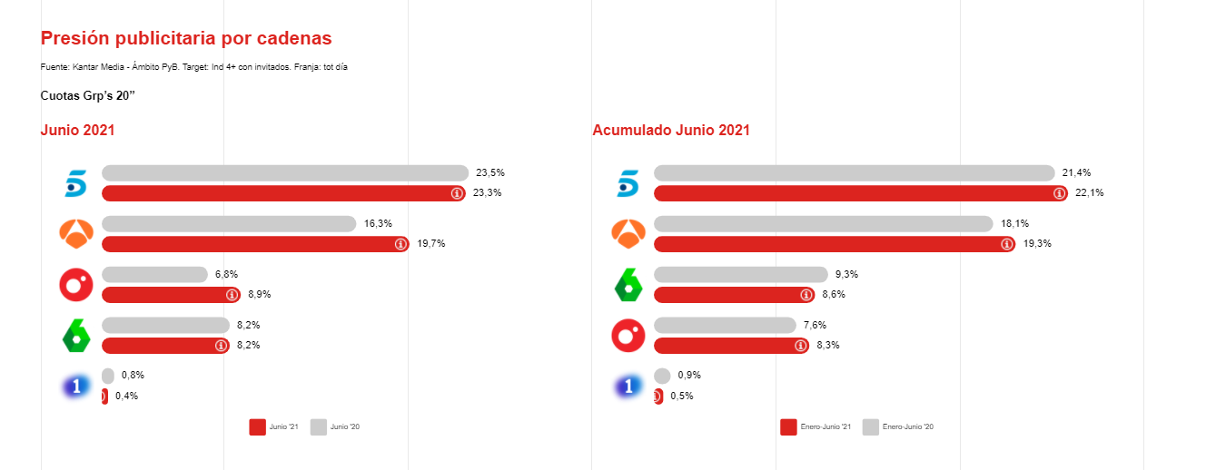 Además, en la comparativa con el 2019, las cifras de junio también son superiores durante el año actual, superando el total de Grp’s a 20” para individuos 4+ en más de un 4% y para RCH en más de un 8%.