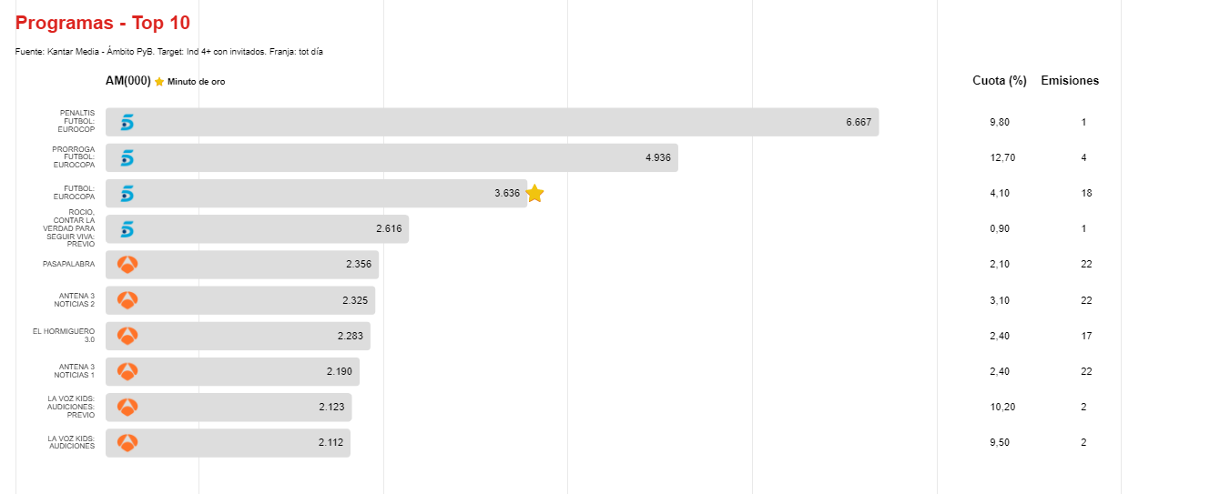 La Eurocopa triunfa durante el primer mes del verano y ocupa el Top 3 de contenidos más vistos del mes: los penaltis del partido disputado entre Francia y Suiza el pasado 28 de junio superaron la barrera de los 6 millones de espectadores.