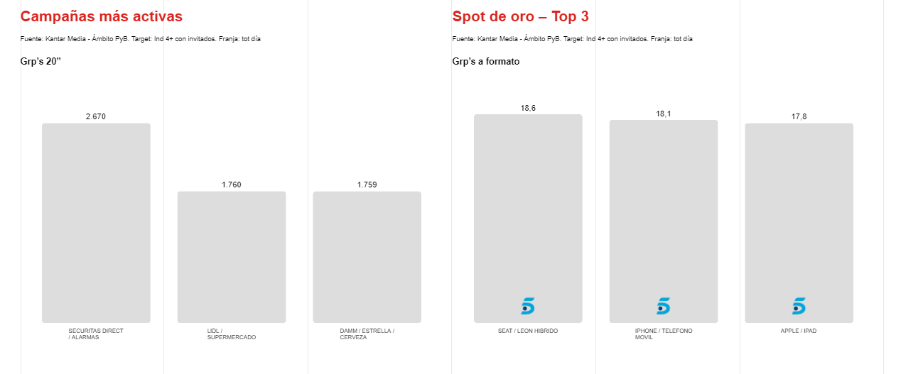 Dentro de las campañas más activas, Securitas Direct consiguió el primer puesto de la clasificación al emitir 2.670 Grp’s a formato. El titulo del Spot de Oro del mes cayó en manos de Seat con los 18,6 Grp’s a formato a los que llegó durante el partido de la Eurocopa emitido el 14 de junio.