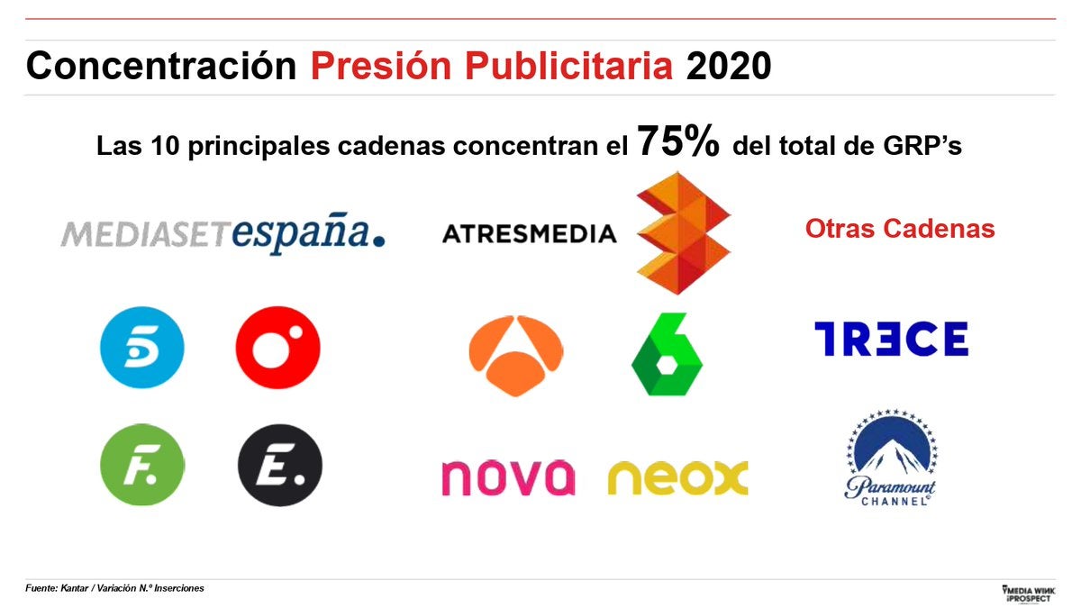 De las 119 cadenas controladas por Kantar, 10 de ellas concentran el 75% de la presión publicitaria televisiva emitiendo el 20% de inserciones