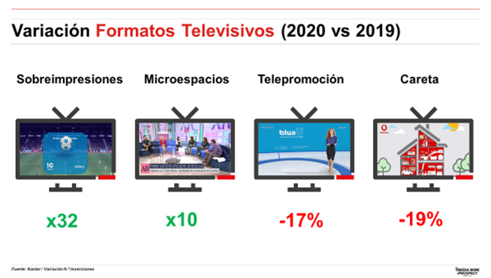 Los mayores crecimientos se han producido en sobreimpresiones, que ha multiplicado por 32 la cifra de 2019; los microespacios, que la multiplica por 10, y la publicidad virtual, con un incremento más moderado. Junto a ellos, los formatos distintos del spot normal que más decrecen son el cartón / careta, que cae un 19%, y la telepromoción, que lo hace un 17%.