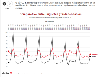 - En los últimos 6 años la diferencia en la búsqueda online de videojuegos frente a los juguetes se ha reducido a la mitad.