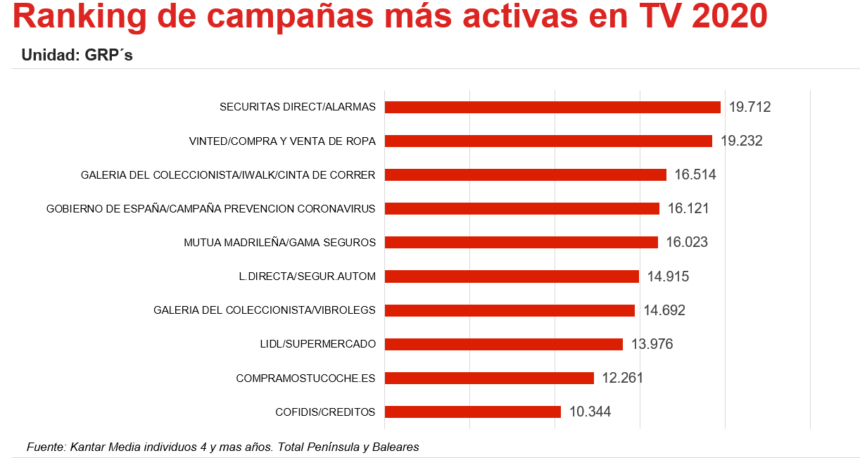 El ranking de campañas más activas de 2020 lo encabeza Securitas Direct con su campaña de alarmas, que ha emitido 24.507 inserciones y obtenido 19.771 GRP’s. Le sigue Vinted, la comunidad internacional de ropa de segunda mano, que ha emitido 134.753 inserciones para obtener 19.231 GRP’s.