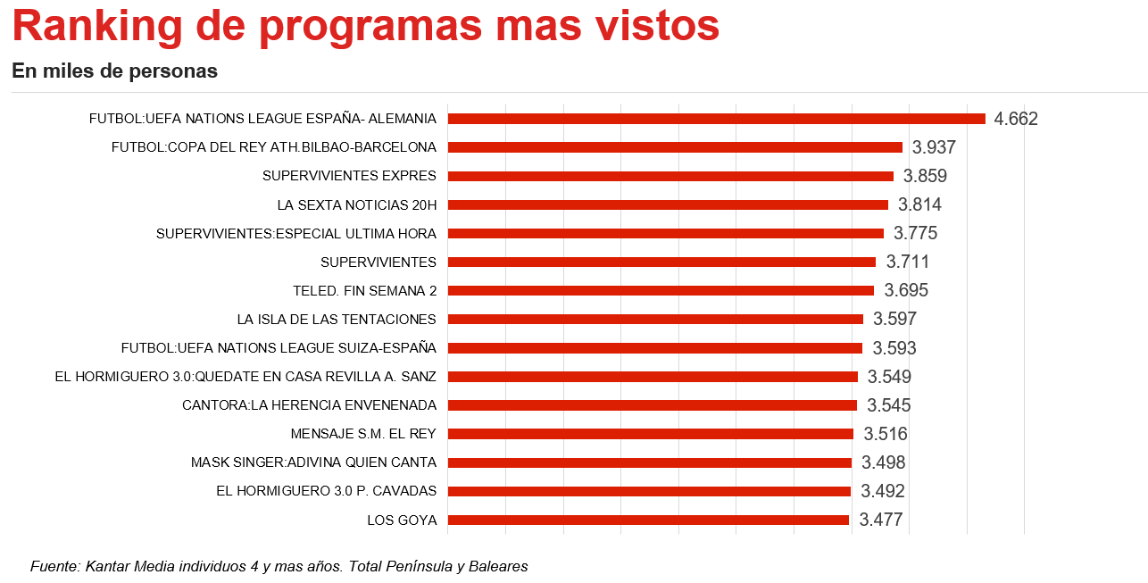 En cuanto al ranking de programas más vistos a lo largo de este año, están liderados por dos partidos de fútbol: el primer puesto del podio es para el encuentro celebrado el 17 de noviembre entre España y Alemania, retransmitido por La1 de Televisión Española y correspondiente a la UEFA NATIONS LEAGUE, que acabó con el triunfo del combinado nacional por seis goles a cero ante más de 4,5 millones de espectadores.