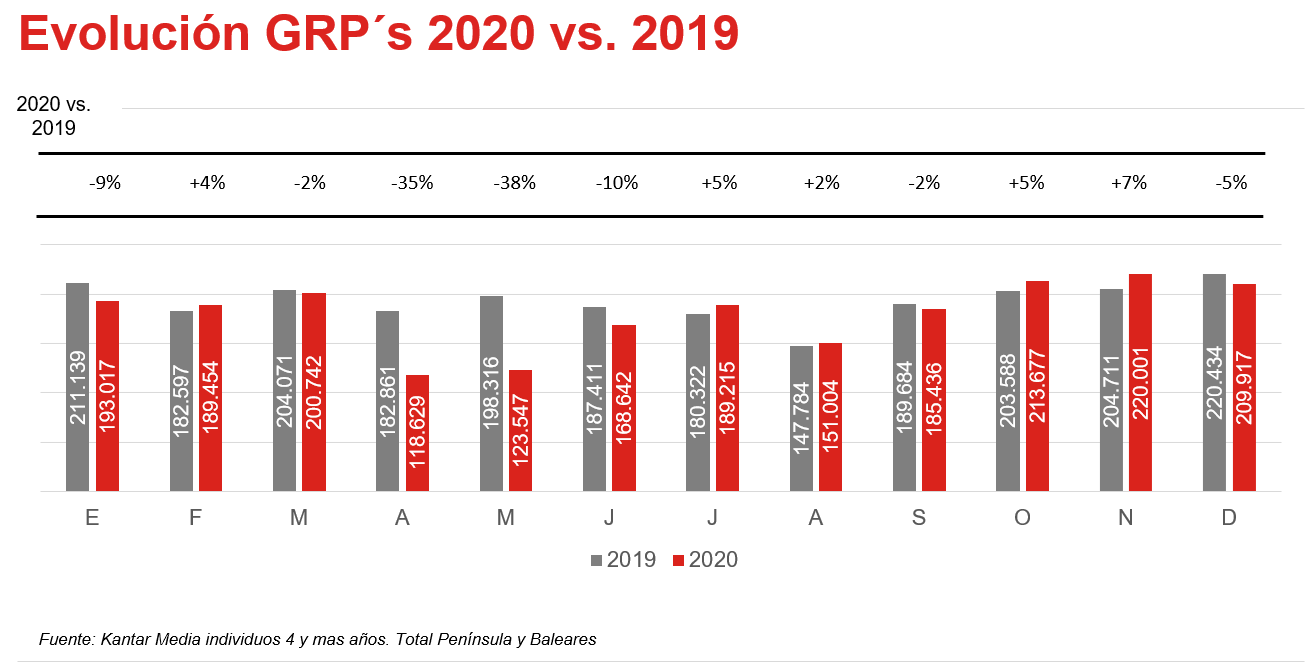 La presión publicitaria remontó a lo largo de la segunda mitad del año con crecimientos del 1,5% y del 2,3%, en el tercer y cuarto trimestre, respectivamente (hasta el día 27 de diciembre), frente a 2019. En el balance del año 2020 los GRP´s caen alrededor de un 6,5%, con unos 16.000 menos.