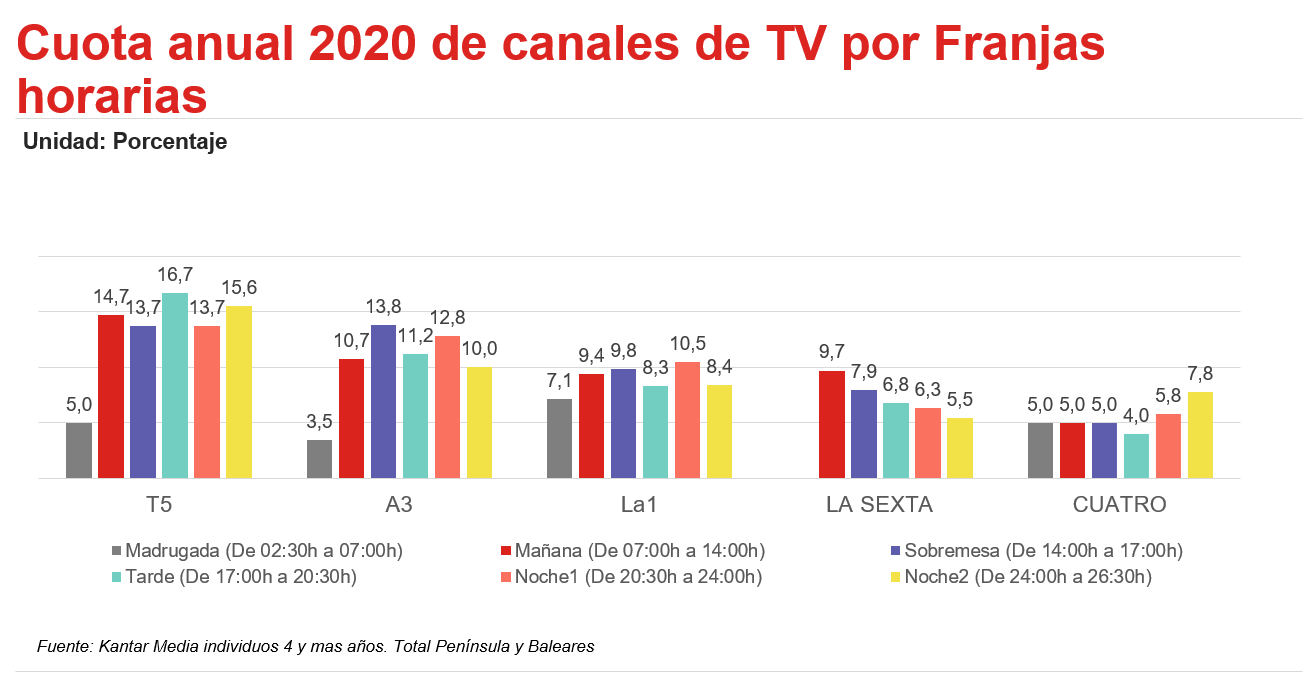 Al analizar las cuotas de las principales cadenas por franjas horarias, Telecinco obtiene sus mejores resultados en la franja de tarde, de 17:00 a 20:30, con una cuota del 16,7% y un crecimiento de casi un punto porcentual, y en la franja de Late Night, de 24:00 a 26:30, con un 15,6%. No obstante, es en esta última donde registra una mayor caída de cuota y pierde más de 3 puntos respecto a 2019.