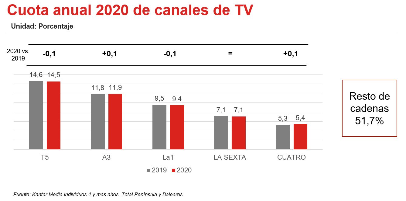 Al analizar la evolución de las cadenas de Televisión en el último año y en el total día, destaca el liderazgo de Telecinco por noveno año consecutivo, con una cuota de cadena del 14,5%, pese a un descenso de una décima en el último año. En cuanto al resto, Antena3 consolida su segunda posición con un 11,9% de cuota y La1 mantiene el tercer puesto con un 9,4%, seguidas de La Sexta y Cuatro, con un 7% y un 5,4%, respectivamente. Estas cinco cadenas concentran un 50% del consumo de televisión en nuestro país.